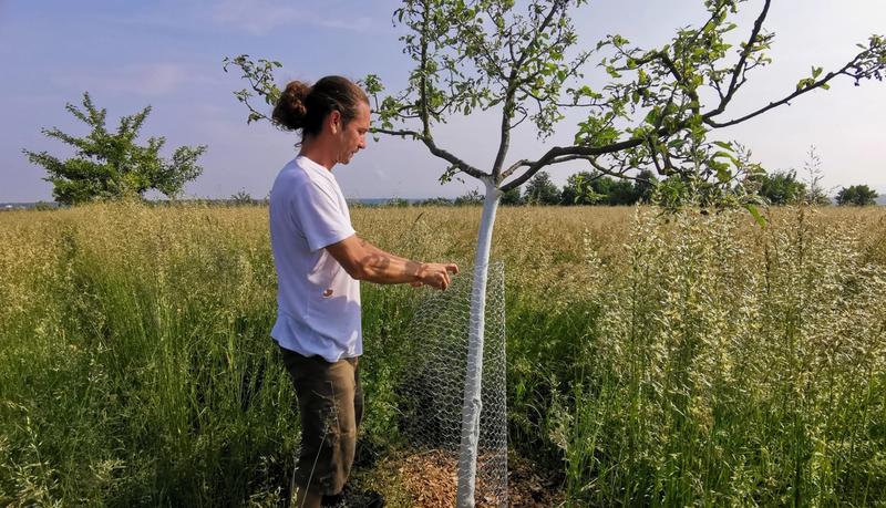 Auch im Juli gibt es bei Jungbäumen einiges zu tun. Das Wässern (wie in unserem letzten Newsletter beschrieben) ist weiterhin wichtig, denn die Niederschlagsmengen waren auch im Mai und Juni unterdurchschnittlich. Bei Bäumen in der Erziehungsphase sollte man auch im Sommer auf einen stabilen Kronenaufbau achten. Oft gibt es sogenannte „Quertreiber“, die nicht in die gewünschte Richtung wachsen. Diese kann man komplett entfernen oder durch Pinzieren im Wuchs bremsen. Beim Pinzieren werden nur die Triebspitzen entfernt. Das hat den Vorteil, dass nicht so viel wertvolle Laubmasse verloren geht. Die Wuchskraft wird wieder in die gewünschten Astpartien gelenkt. Leitäste, die nicht den erstrebten 45°-Winkel haben, kann man jetzt noch gut durch Abspreizen oder Hochbinden korrigieren. Dieses Jahr erwarten wir reichlich Früchte. Bei Jungbäumen kann dies jedoch schnell zum Problem werden, denn starker Fruchtbehang belastet zum einen die Stabilität des Baumes, zum anderen könnte der Baum die Energie, die in die Früchte fließt, besser beim Kronenaufbau gebrauchen. Deshalb ist es ratsam, Früchte auszudünnen oder sogar, insbesondere an Leitästen und an der Stammverlängerung, komplett zu entfernen. Schließlich gilt: je mehr man bei der Erziehung des Baumes investiert, desto mehr Freude (und Ertrag) hat man später.