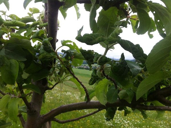 Die mehlige Apfelblattlaus verursacht dagegen Blatt- und Triebdeformationen. Die Blätter rollen sich ein und Triebe wachsen stark verkrümmt und bleiben dünn und schwach.