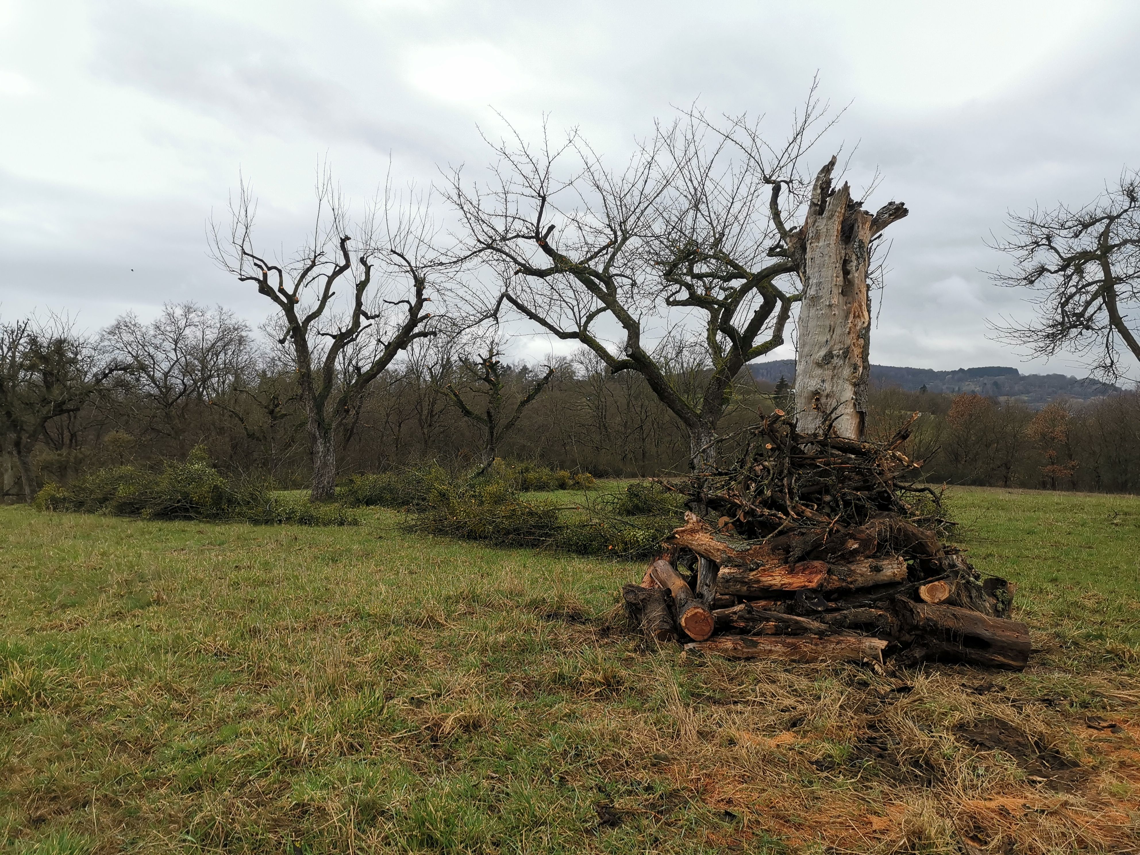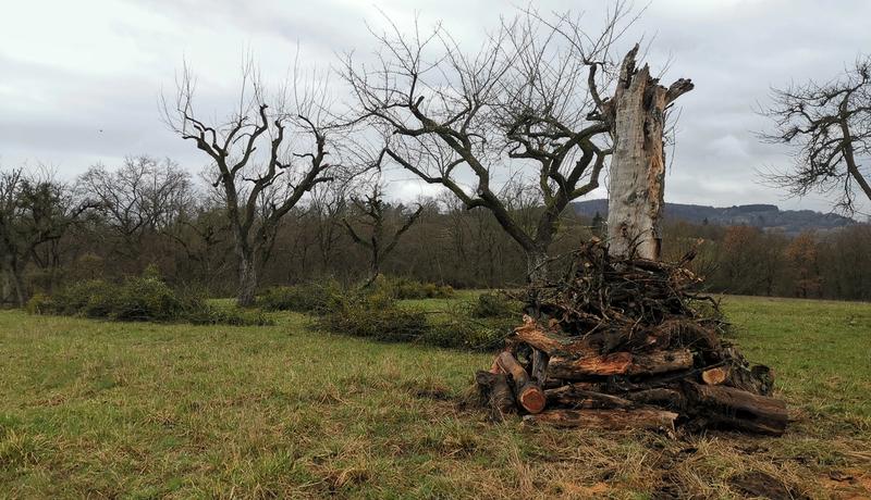 Totholzhaufen bieten Igel, Blindschleichen und vielen anderen Tieren wertvolle Lebensräume und bereichern das Biotop Streuobstwiese. Diese einfache Lösung kommt allerdings nur bei kleineren Schnittgutmengen in Frage. Außerdem sollte genügend Platz vorhanden sein, damit evtl. auswachsende Brombeeren oder andere Pflanzen nicht zum Problem werden.