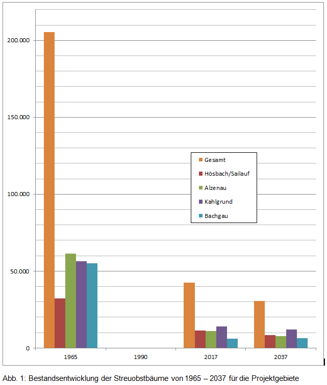 Die aktuelle Bestandserhebung wurde mit der Obstbaumzählung von 1965 verglichen und anhand der Altersstruktur der Bestände wurden Bestandsprognosen für die nächsten 20 Jahre erstellt. Demnach ist die Anzahl der Streuobstbäume im Untersuchungsgebiet von ca. 205.000 im Jahr 1965 auf 42.000 im Jahr 2017 zurückgegangen. Das bedeutet einen Bestandsrückgang um fast 80 %. Hochgerechnet auf den gesamten Landkreis bedeutet das einen Rückgang von ehemals 460.000 auf heute (2017) 97.000 Bäume. Aufgrund der aktuellen Alterstruktur ist in den nächsten 20 Jahren ein weiterer Bestandsrückgang um weitere 30 % des heutigen Bestandes zu erwarten. Um die Anzahl der Obstbäume bis 2037 stabil zu halten, müssten im Untersuchungsgebiet jährlich 1.000 Bäume gepflanzt und gepflegt werden. Will man den Baumbestand im gesamten Landkreis auf dem heutigen Stand halten, wären im Landkreis jährlich 2.250 Bäume zu pflanzen. In den einzelnen Projektgebieten ist der Nachpflanzbedarf in Hösbach, das über die größten Streuobstbestände verfügt, am größten. Hier müssten für den Bestandserhalt ca. 250 Bäume pro Jahr gepflanzt werden.